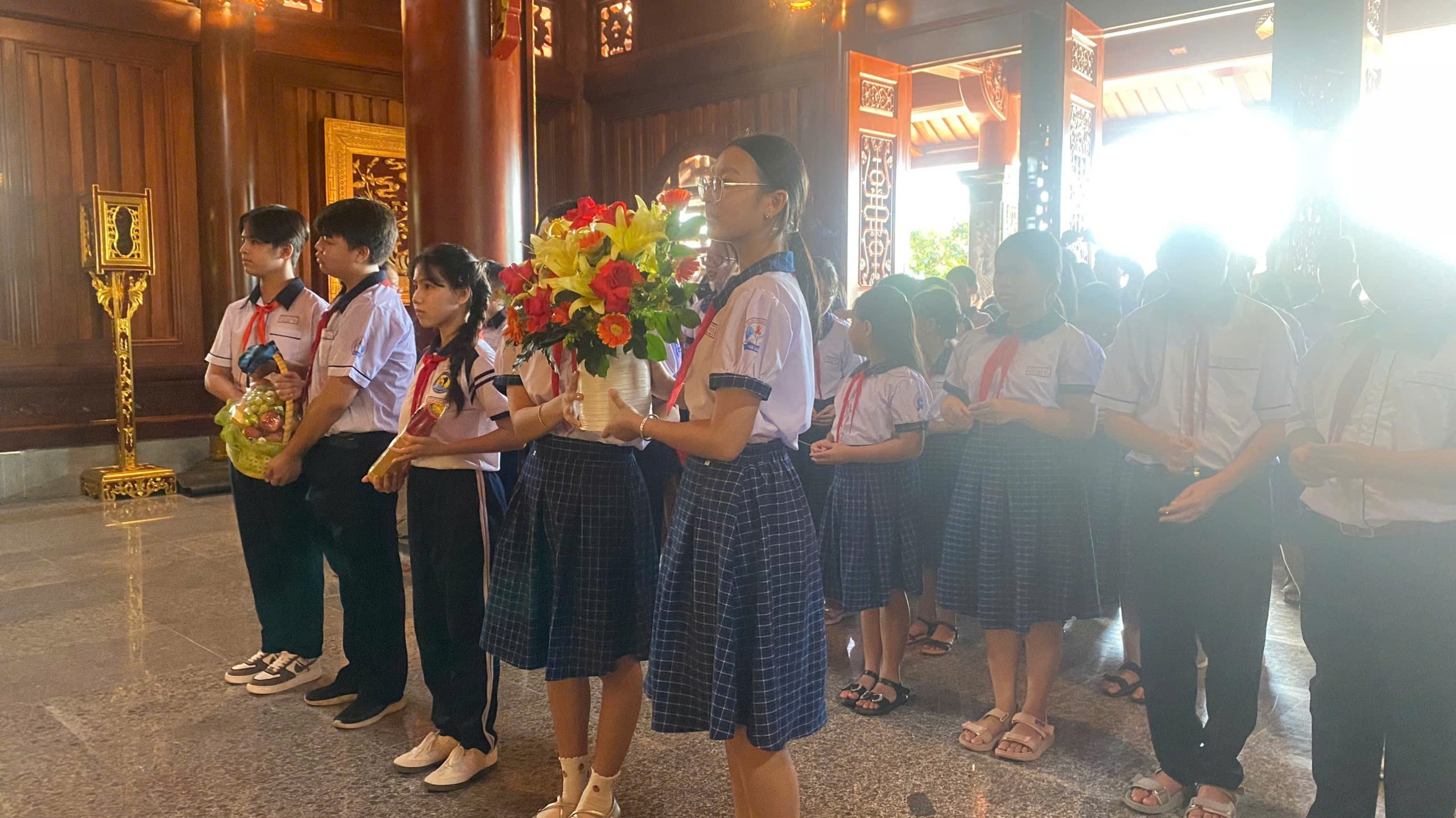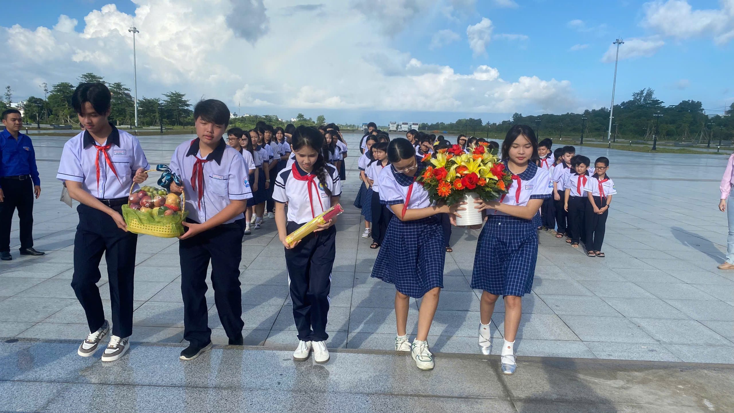 Đúng 7 giờ 30, các em xuất phát đến khu quảng trường Hồ Chí Minh, dâng hoa và thắp hương cho Bác Hồ kính yêu. Ngoài ra, tại đây các em còn được tham quan nhà trưng bày các tư liệu về Bác, qua đó các em càng thêm kính yêu vị cha già của dân tộc.
