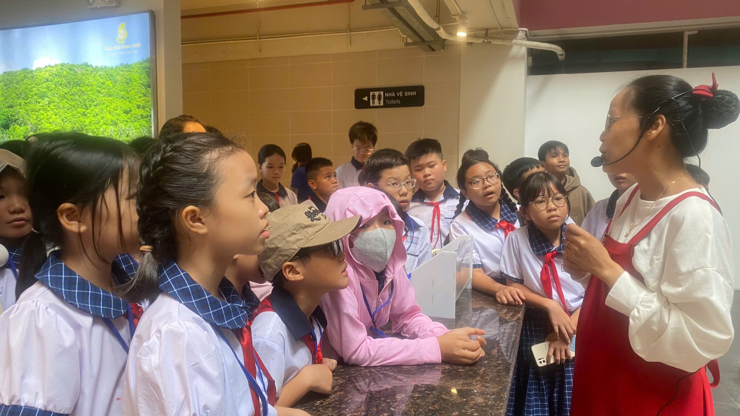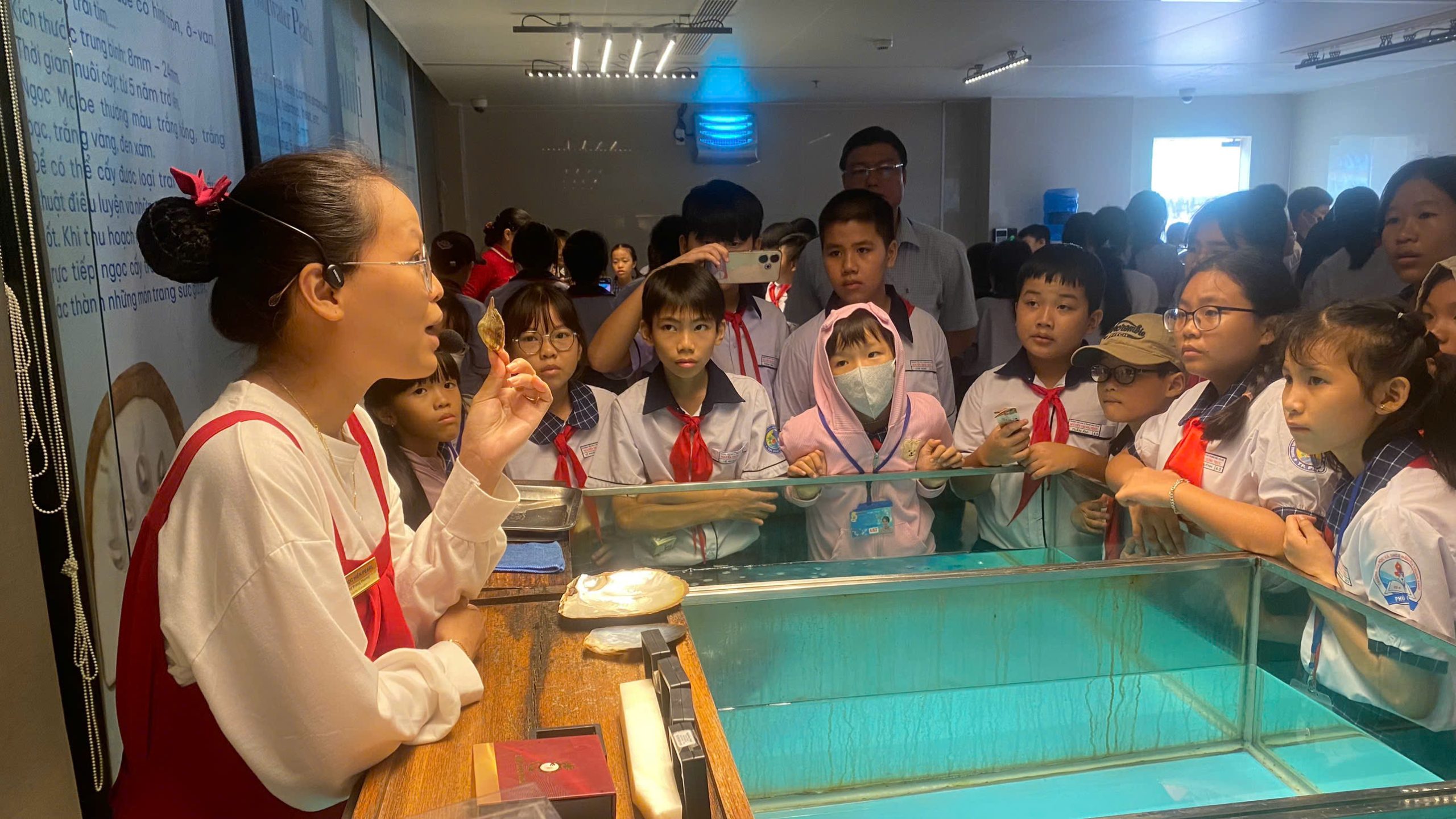 Sau đó, các em di chuyển đến cơ sở sản xuất ngọc trai Ngọc Hiền ở xã Dương Tơ, được nghe giới thiệu về quy trình nuôi cấy trai lấy ngọc, quy trình làm nên các sản phẩm trang sức có giá trị từ ngọc trai. Các em còn được tham quan khu trưng bày các cổ vật được lấy từ đáy đại dương, hay được xem những nghệ nhân điêu khắc các sản phẩm trưng bày từ vỏ trai.