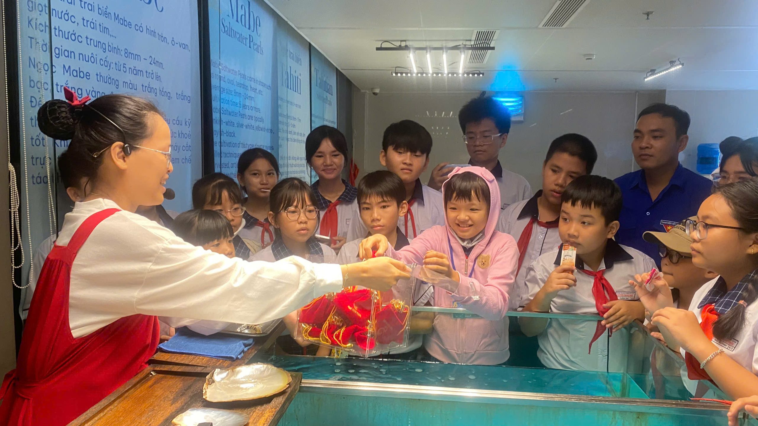 Các em thực sự hứng thú với phần giao lưu trả lời câu hỏi có thưởng sau khi nghe các nhân viên cơ sở ngọc trai thuyết minh những thông tin liên quan đến ngọc trai. Khi câu hỏi được đặt ra, nhiều cánh tay giơ lên xin trả lời khiến những nhân viên vô cùng khó xử vì không biết nên chọn em nào vì tất cả các em đều xứng đáng.