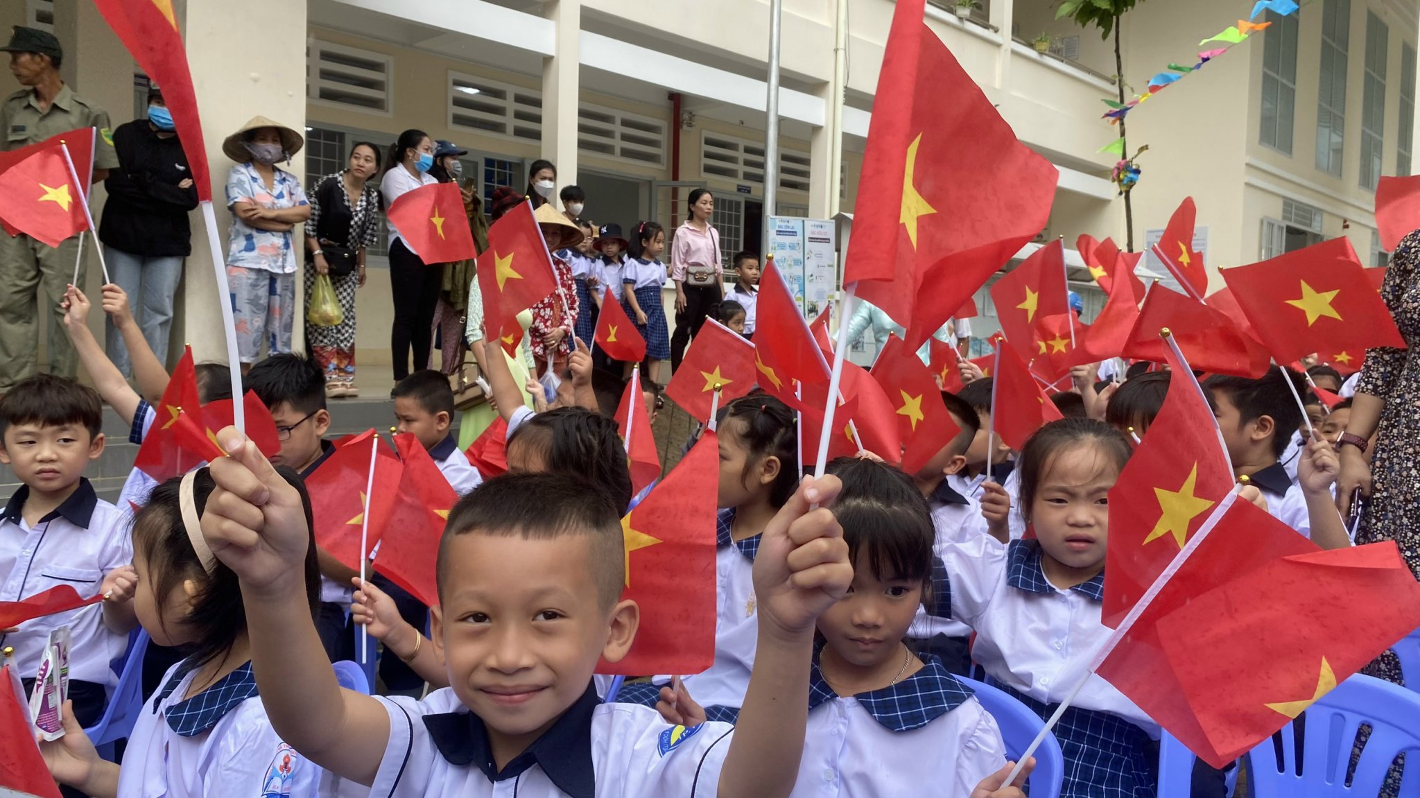 Ảnh: HS lớp 1 hân hoan chào đón năm học mới