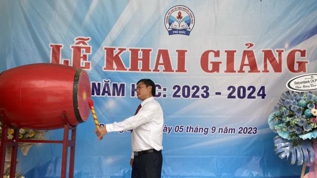 Ảnh: Hiệu trường nhà trường đánh trống khai giảng