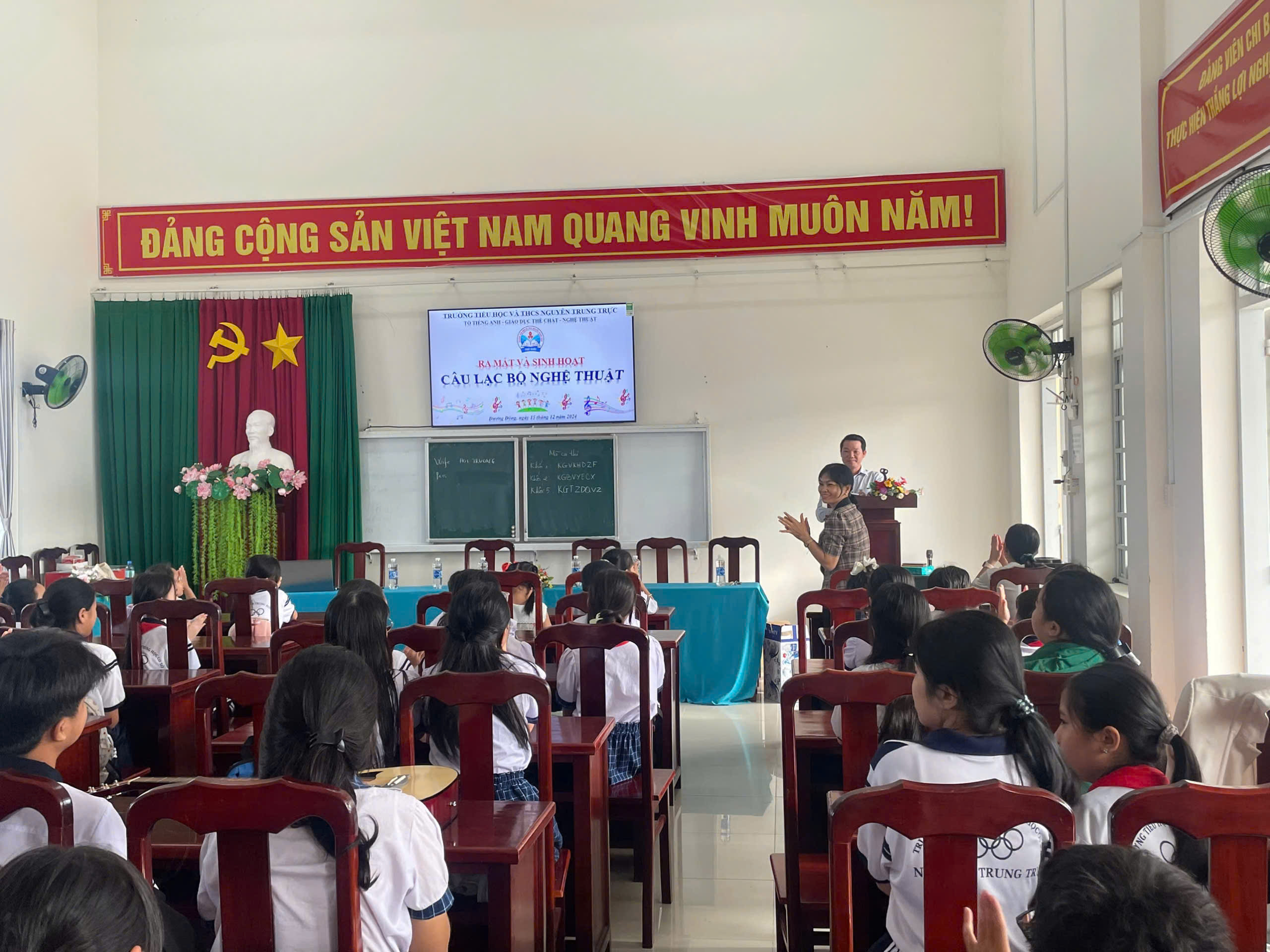 Về dự buổi ra mắt và sinh hoạt CLB Nghệ thuật có sự tham dự của cô Trần Thị Mỹ Hường, Phó bí thư chi bộ, Phó hiệu trưởng nhà trường, Cô Nguyễn Thị Diệu tổ trưởng tổ chuyên môn Tiếng Anh – GDTC – Nghệ thuật, cùng toàn thể 140 học sinh đến từ các khối lớp 1 đến lớp 9 có chung niềm đam mê hội họa, mĩ thuật và âm nhạc.