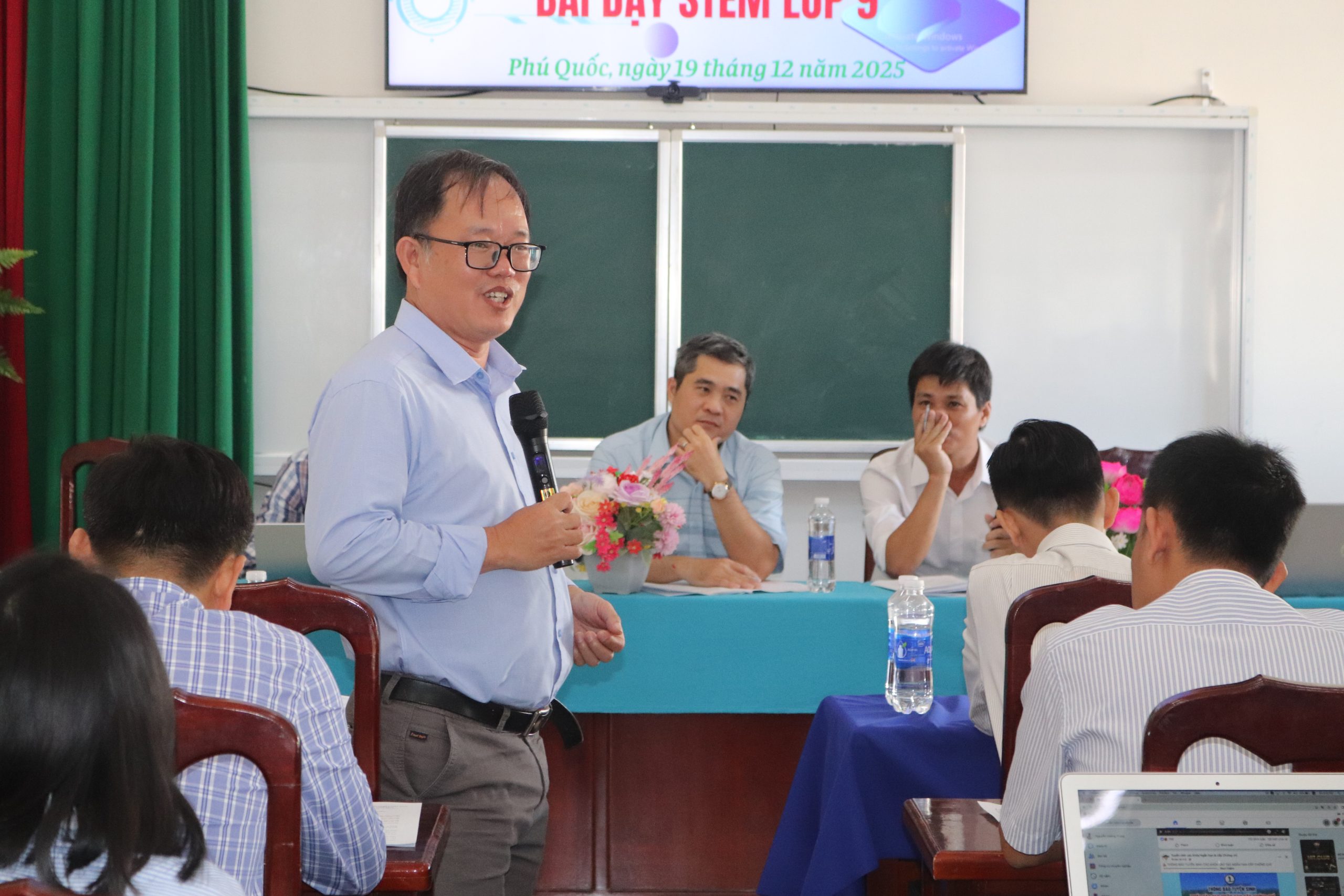 Tại chương trình, các thành viên Hội đồng cốt cán tỉnh An Giang, giáo viên đại diện các đơn vị Xã/Phường/Đặckhu trong cụm 2, đại diện các đơn vị trường trên địa bàn Đặc khu Phú Quốc dự Chuyên đề: Trình bày Sản phẩm: Bài dạy STEM lớp 9, do Thầy Bùi Ngọc Thái – Giáo viên trường THCS An Thới 1 hướng dẫn.