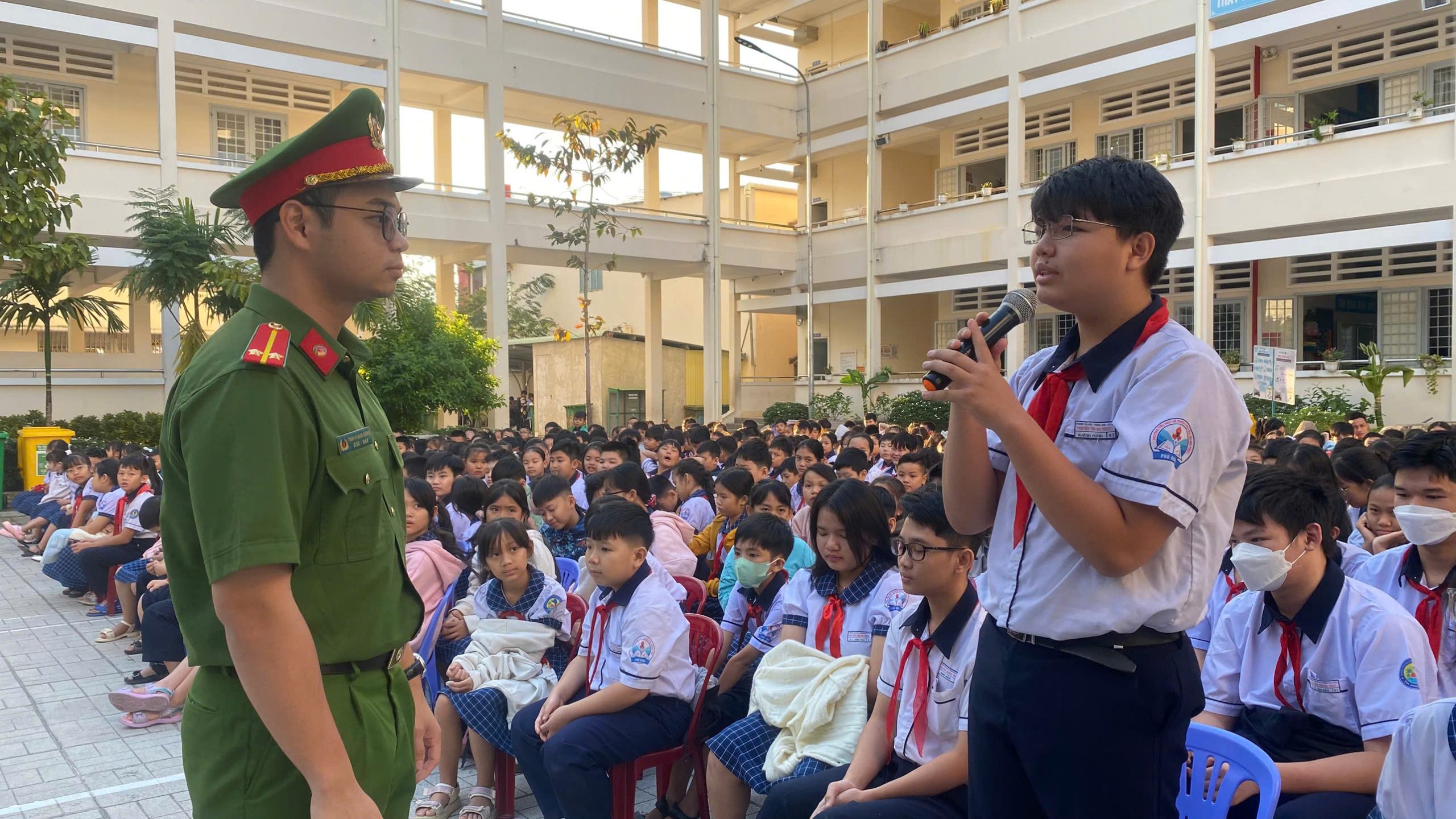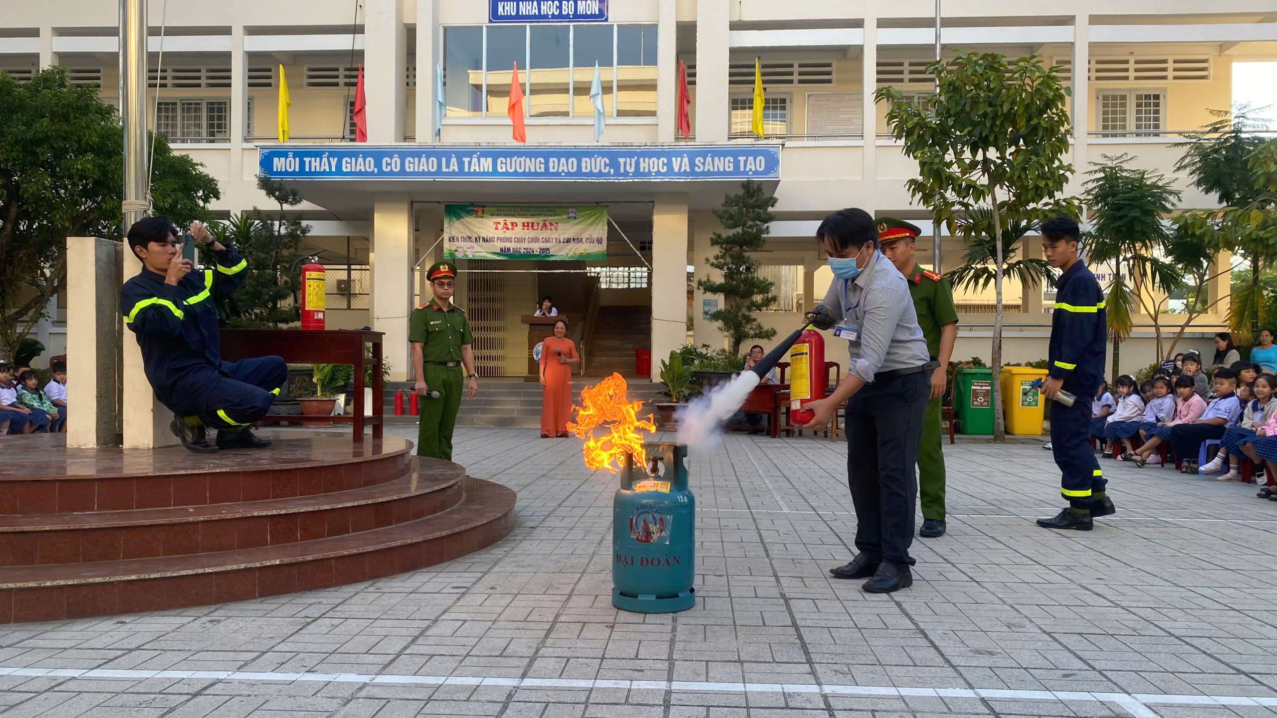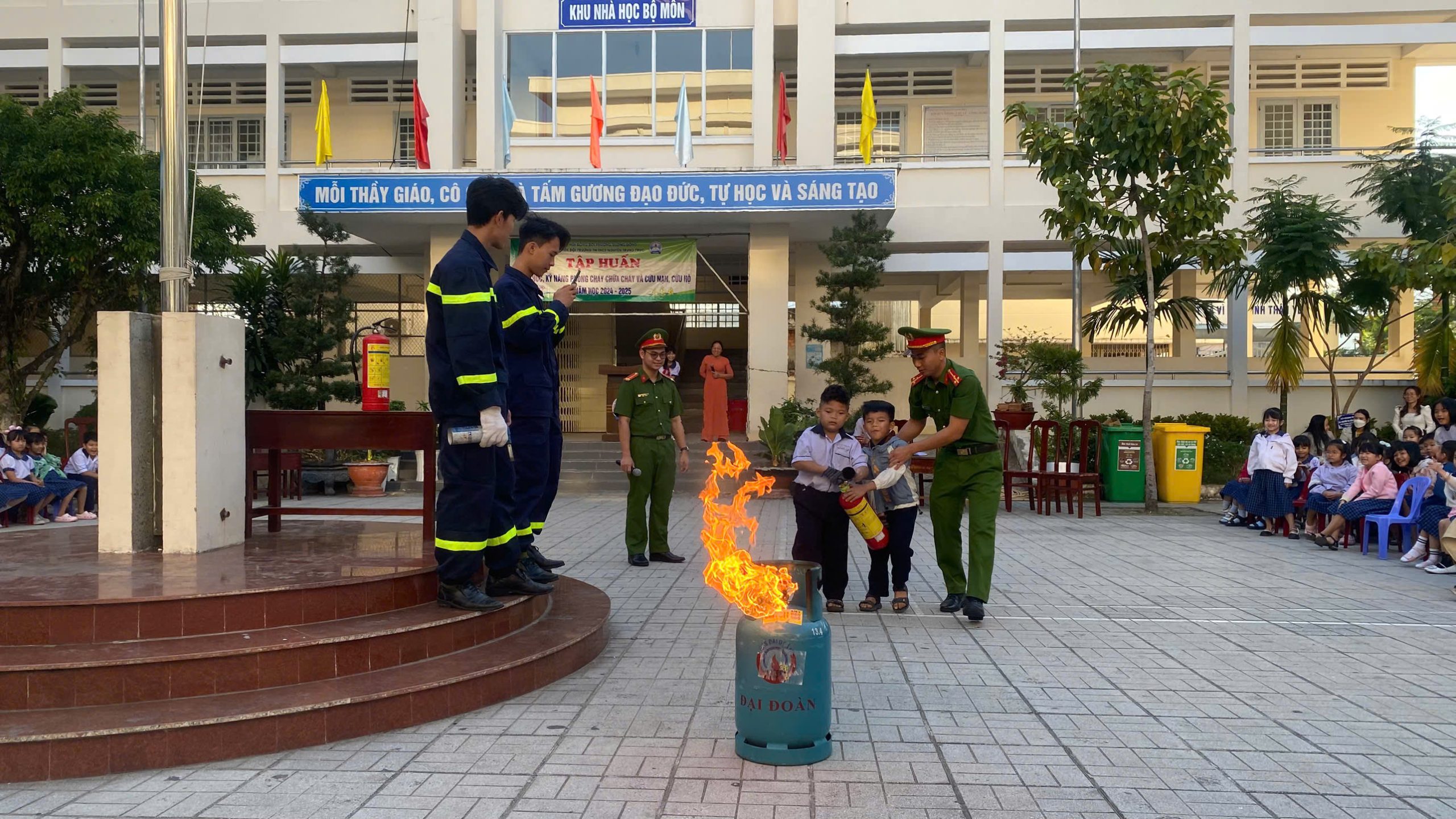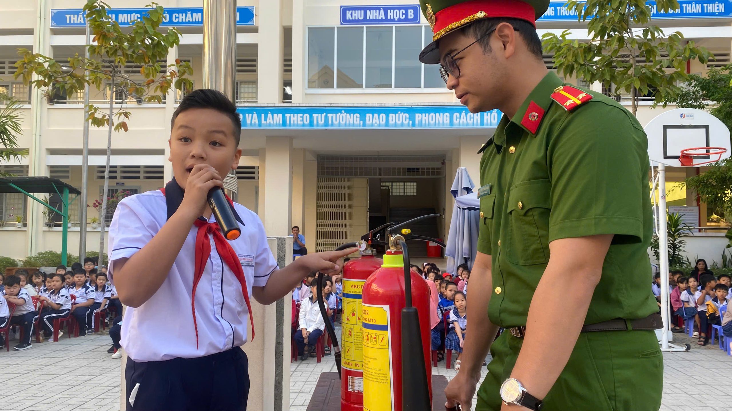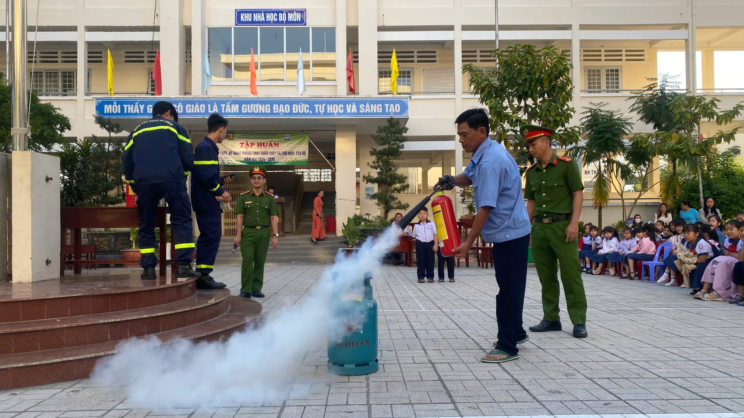 Đặc biệt, các em còn được thực hành chữa cháy. Theo đó, tình huống giả định là có một đám cháy nhỏ trong sân trường, các em dùng bình chữa cháy (loại bình khí) để dập tắt đám cháy. Theo ghi nhận, tất cả các em đều thực hiện thành công sau khi được các cán bộ đội Cảnh sát PCCC hướng dẫn.