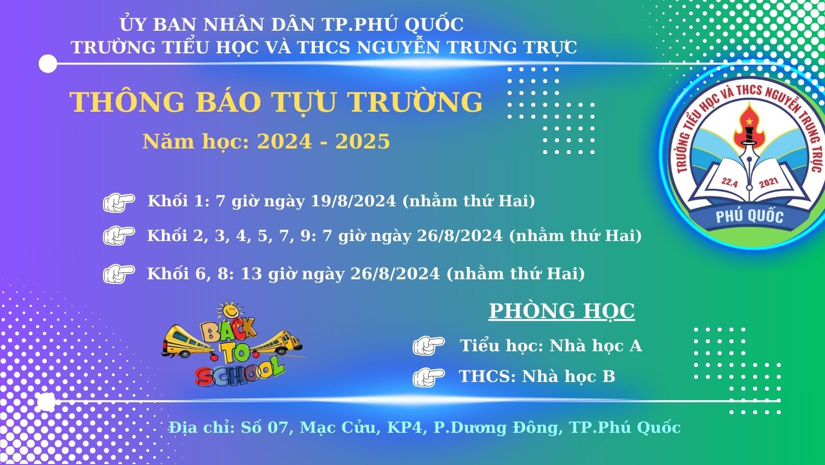 Trường Tiểu học và THCS Nguyễn Trung Trực thông báo đến toàn thể CB, VC, NLĐ, quý phụ huynh và học sinh toàn trường về việc chuẩn bị tựu trường và tổ chức Lễ Khai giảng năm học 2024 – 2025, với những nội dung cụ thể như sau: